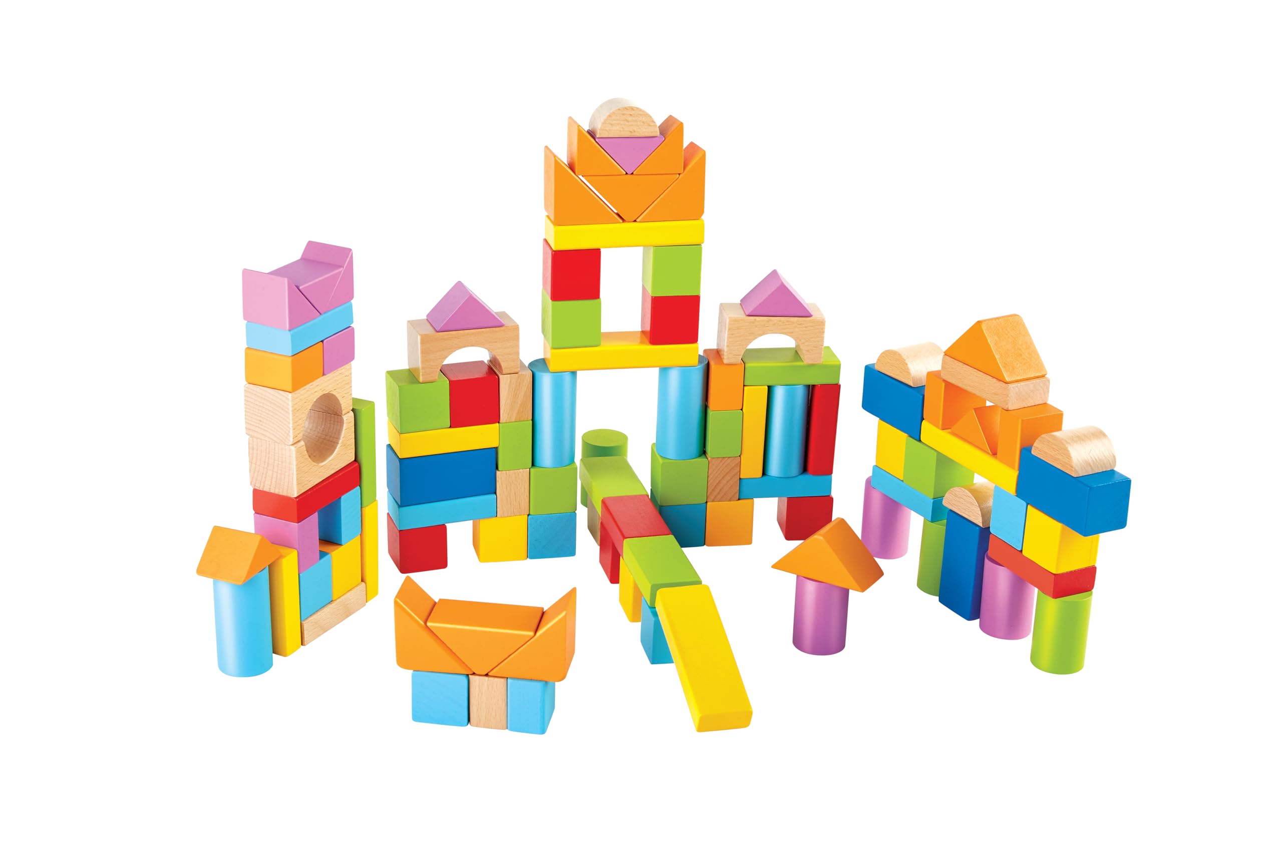 Puzzle de madera que incluye 101 bloques de diferentes formas, como cilindros, cubos, triángulos y rectángulos. Los bloques están fabricados en madera y son robustos, lo que permite a los niños manipularlos y jugar.